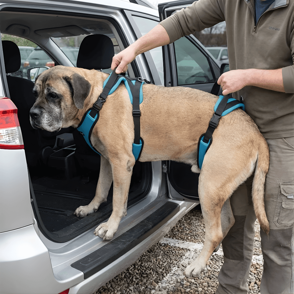 Ja! Einer der häufigsten Einsatzbereiche von PfotenLift™ ist das Ein- und Aussteigen aus dem Auto. Die stabilen, tragfähigen Griffe ermöglichen es dir, deinen Hund sicher anzuheben und zu führen, ohne deinen Rücken zu belasten oder deinem Hund Schmerzen zu verursachen. Gerade bei sehr großen Hunden (über 36 kg) verteilt das Geschirr das Gewicht optimal. In Kombination mit einer Rampe wird es noch einfacher.